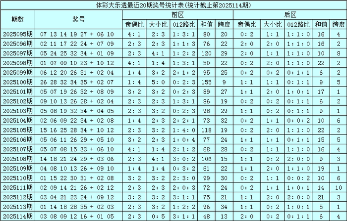 大乐透第2025114期开奖号码为:03、08、09、12、16+01、05。其中前区奖号奇偶比为2:3,大小比为0:5,和值为48,跨度为13,后区奖号奇偶比为2:0,大小比为0:2。