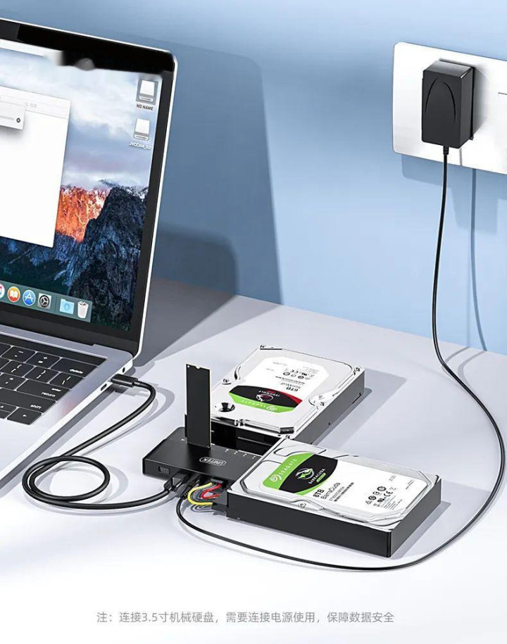 供电方面也不用操心,搭配DC12V2A大功率电源适配器,还有电源隔离保护装置,就算外接20TB的大容量硬盘也毫无压力。再也不用怕电脑 USB 接口供电不足导致传输中断,备份数据时尽管放心大胆地多盘齐开。